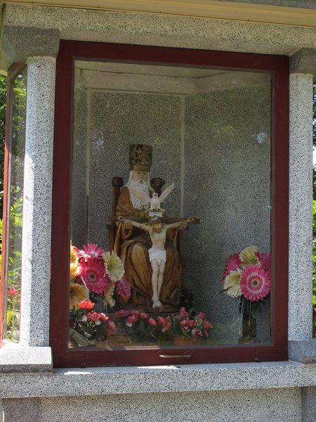 A w Rokitnie mijałem kapliczkę w której umieszczono „Trójcę Świętą”. Zapachniało mi herezją ale przecież Bóg nie raz był malowany i nie tylko przez Michała Anioła. I Duch Święty… Kapliczka i rzeźby są chyba nowe. I przypominają mi uproszczoną wizję z Biblii dla dzieci.