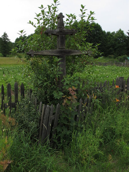 Plan przewidywał teraz jazdę do Radziwiłłówki i podążanie żółtym szlakiem turystycznym pieszym. W ten sposób zobaczyłbym kilkanaście bunkrów Linii Mołotowa. Ale już było po 16. Czas pędził. No i na bunkrach to ja się nie znam. Kolejny punkt programu – Góra Grabarka. Od co najmniej dwóch lat się tam wybierałem. Nie szukałem więc znaków szlaku tylko pojechałem dalej. Już było jasne, że nie ma co myśleć o jeździe do Tykocina. Bielsk Podlaski też już wydawał się być poza zasięgiem. Grabarka zaś była blisko. Po drodze minąłem znak wskazujący źródło w lesie. Jeszcze nie wiedziałem, ze świętość Góry Grabarki jest związana ze źródłami. A to było jedno z nich. Nastrój po drodze budowały przydrożne krzyże. Większość nowoczesnych ale ja najbardziej lubię te drewniane, ulegające działaniu czasu.