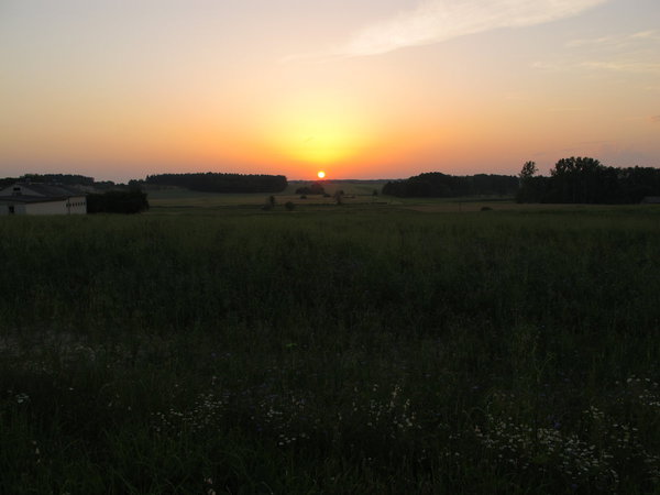 Na liczniku miałem 123 km. Mało. A czułem się jak po ponad 200. Słońce i temperatury wyssały ze mnie siły. Powoli ruszyłem więc do najbliższej przeprawy na Bugu. Do Siemiatycz. Przeprawa nie była miejscem szczególnie miłym. Most znacznie łatwiej przejechać niż po nim przejść. Droga (krajowa 19) bez utwardzonego pobocza i nierówna. Początkowa myśl by jechać tą drogą do Kocka była mrzonką. W Łosicach odbiłem w stronę Mord. W tym roku jakoś do Mord dojechałem bocznymi drogami z Łukowa. Chciałem teraz pojechać w stronę przeciwną. W nocy. Nie wiem co mnie natchnęło by zatrzymując się na chwilę w Łosicach wyłączyć tylne światło. Jeszcze nie było całkiem ciemno. Chwilę wcześniej zrobiłem zdjęcie słońcu.