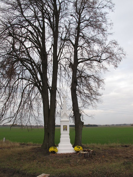 Przez Sydół pojechałem po to by przejechać przez Zwolenkę. Czyli z Wólki Szelężnej przedostać się gruntową drogą do Nowej Zielonki. Tutaj już wjechałem na drogę rano przejechaną. Ale… za Zielonką wypatrzyłem białą figurę przy polnej drodze. Tyle razy tędy jeździłem i nigdy jej nie widziałem. Kapliczki, figury i krzyże przydrożne są elementem krajobrazu. A tu jeszcze z żywymi kwiatami.