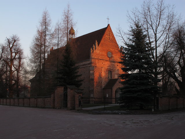 Kościół w Stężycy (jeden z dwóch). Jeszcze modrzewie nie zasłaniają.