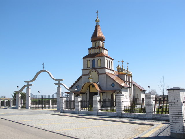 Bug szeroko się rozlał. Bardziej niż Wieprz. Plan przewidywał zjazd w pierwszą drogę w lewo. I nie zjechałem. Przy samej drodze była woda. Pomyślałem, że to pewnie nie ta droga. I się pomyliłem. Tak więc z jednej drogi krajowej wjechałem w następną. Na szczęście nie była zapchana samochodami. Dało się jechać spokojnie. W pierwszej mijanej miejscowości zaintrygowały mnie błyszczące w słońcu kopuły cerkwi. Musiałem do niej podjechać.