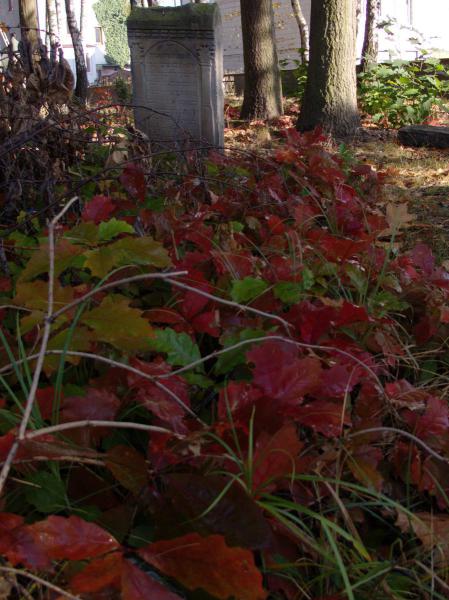 Za to w Łaskarzewie zauważyłem zmiany na cmentarzu żydowskim. Złomiarze (chyba złomiarze) pozabierali gwiazdy Dawida umieszczone w murze cmentarza. Dwa lata temu brakowało dwóch. Teraz tylko dwie zostały. Ale i tu widać jesień. Młode dęby czerwieniły się w mokrej trawie.