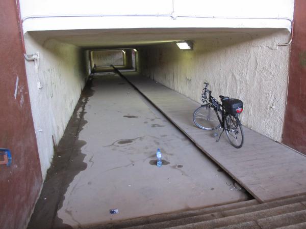 Taki zamyślony i "zagubiony" dojechałem do drogi gruntowej. Rozpoznałem ją bezbłędnie. Już kiedyś jej szukałem na mapach. Jechałem tędy tylko raz. Akurat gdy się zgubiłem w okolicach Garwolina. Teraz też się zgubiłem :) i dlatego dojechałem do tej zagubionej drogi. Chyba nie ma jej na mapach Google. Wcale nie powinno mnie to dziwić. W końcu to droga gruntowa i tylko jej koniec jest wybrukowany. Dojechałem nią chyba do Izdebnika. Chyba. Sam nie wiem. Ale udało mi się dojechać do Rębkowa, a o to mi chodziło. Odnalazłem się więc ale tylko na chwilę. W Rębkowie (a może już w Garwolinie? wg map to Wola Rębkowska) przejechałem przez wiadukt nad torami zamiast zakręcić przed wiaduktem. Szukając dalszej drogi postanowiłem się trzymać czerwonego szlaku rowerowego i tak dojechałem do stacji kolejowej Garwolin i przejścia podziemnego którym szlak ten poprowadzono. Dla ułatwienia nie zrobiono podjazdów dla wózków, rowerów i innych środków transportowych kołowych. Za to zrobiono w podziemiach drewniany podest dla pasażerów nie posiadających kaloszy. Dawno intensywnie nie padało ale ktoś przyniósł trochę wody w butelce.