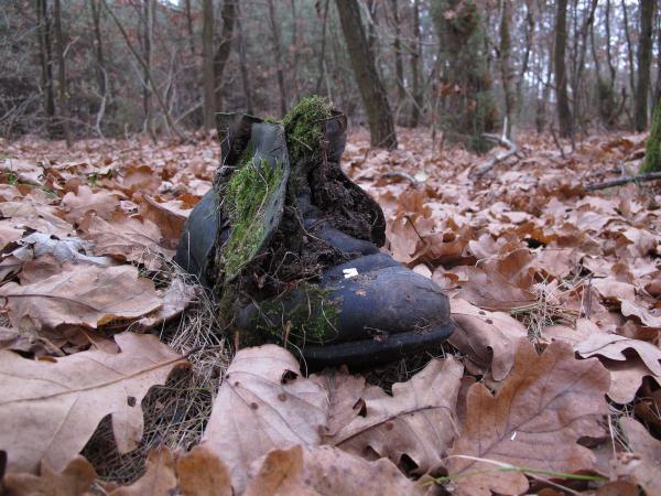 Przy drodze w tej części lasu widziałem dwie tabliczki zakazujące wyrzucanie śmieci do lasu. Chyba jak zwykle ludzie potraktowali to jako zaproszenie do wyrzucania śmieci. Są tam duże ilości szklanych butelek, część potłuczona. Uważnie stąpając doszedłem do … buta. Buta wydobytego spod ziemi.